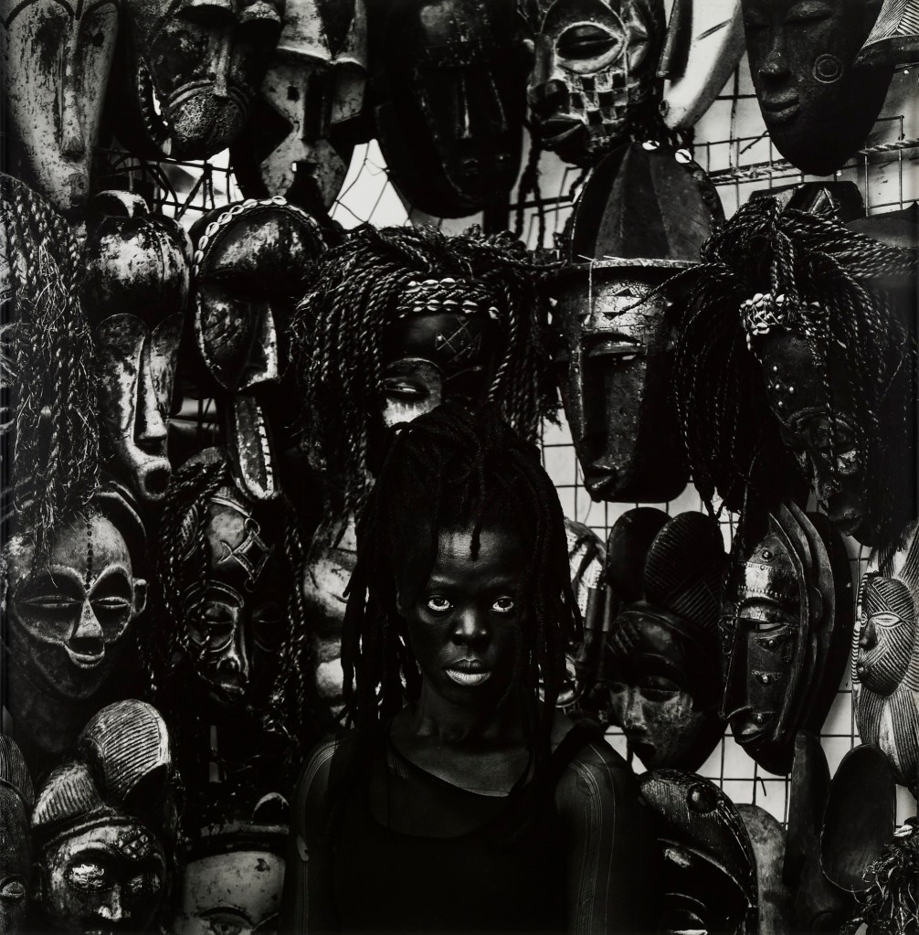This photo has lots of symbolic elements to it, such as: Masks, which are symbolic to the fact that she could be covering who she truly is. Repetition which symbolizes a pattern of behavior and emphasizes a message. This tells me that she has masked her true identity for a while but because she is not wearing a mask she has embraced her true self.